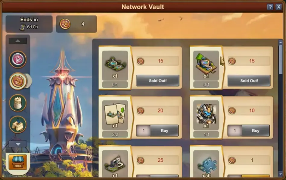 - Tausche drei Gegenstände beim Antiquitätenhändler oder beende (2-13)-mal eine 8h Produktion und bezahle (5-45) aktuelle Güter oder (5-45) Güter des vorherigen Zeitalters