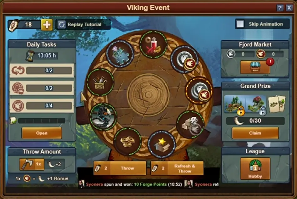 Setze Schicksalsamuletts ein , um Äxte auf das Schicksalsrad zu werfen , wertvolle Belohnungen, Muninn-Münzen und Geri-Münzen zu ergattern und dem Hauptpreis immer näher zu kommen . Doch sei wachsam, deine Rivalen aus der Nachbarschaft beobachten dasselbe Rad und sind bereit, sich die Schätze unter den Nagel zu reißen! Und denk daran: Das Glück ist mit den Stärksten, also nutze jeden Wurf!