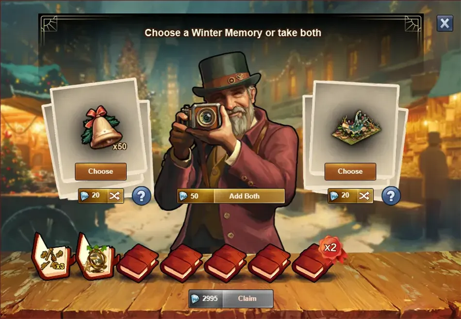 In den Wintererinnerungen werden dir die Preise der Elfen angezeigt. Hier hast du die Möglichkeit einen von zwei Preisen auszuwählen oder wenn sie dir nicht gefallen mit Diamanten zu wechseln. Du hast auch die Möglichkeit beide dir angezeigten Preise mit Diamanten deinen Erinnerungen hinzuzufügen. Deine damit gewonnen Preise werden dir unten im Fenster angezeigt. Du kannst jederzeit diese Preise zu einem festen Preis von 2.995