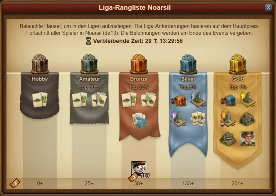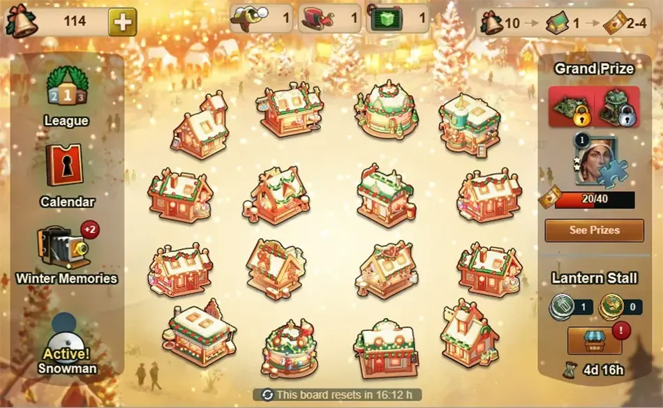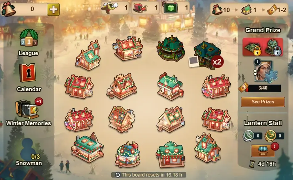 Für 10 Holzglocken kannst du ein Haus beleuchten und erhältst den darin versteckten Preis sowie 1–2 Fortschritte für den Großen Preis. Zusätzlich zu den normalen Belohnungen in den Häusern könnt ihr auch den Kalenderschlüssel, den Schneemann oder spezielle Felder finden, die euch Schätze für eure Wintererinnerungen bringen.